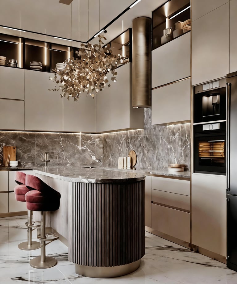 This style focuses on reduced visual clutter, streamlined cabinet forms, and a contemporary composition that supports a calm and highly organized kitchen environment.