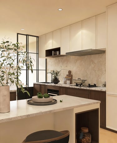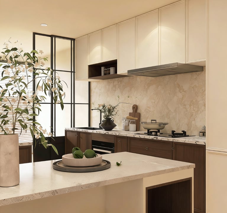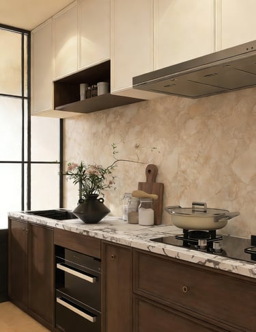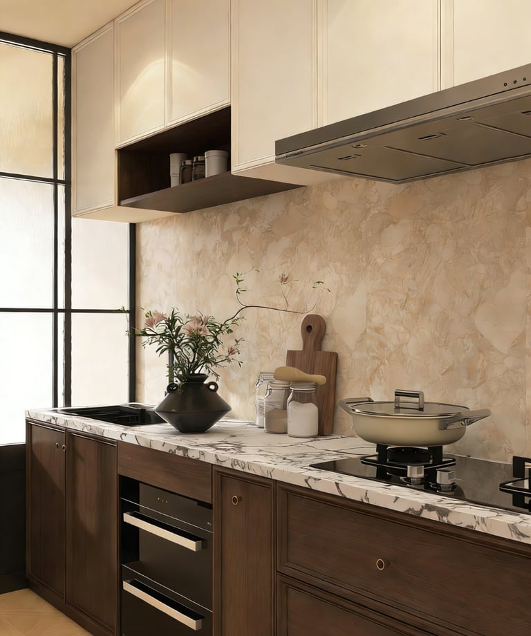 Suitable for villas, upscale apartments, and residential interiors that prefer a warmer and more visually layered kitchen style.