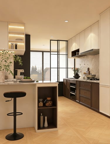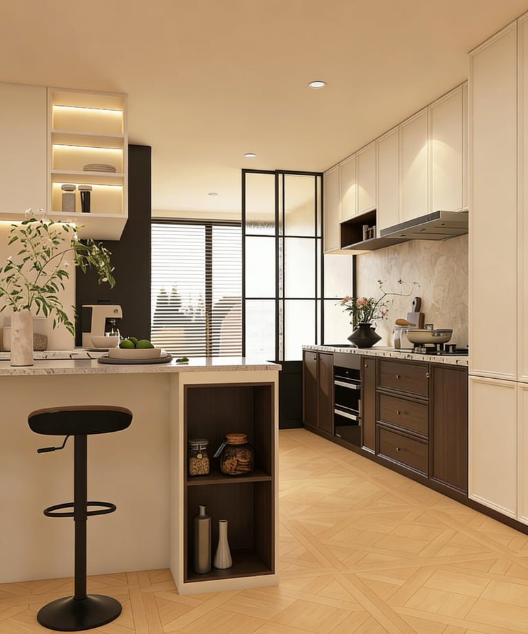 This style emphasizes softer visual transitions, balanced cabinetry proportions, and a more expressive yet refined interior mood. It is suitable for clients who want a kitchen that feels elegant rather than severe.