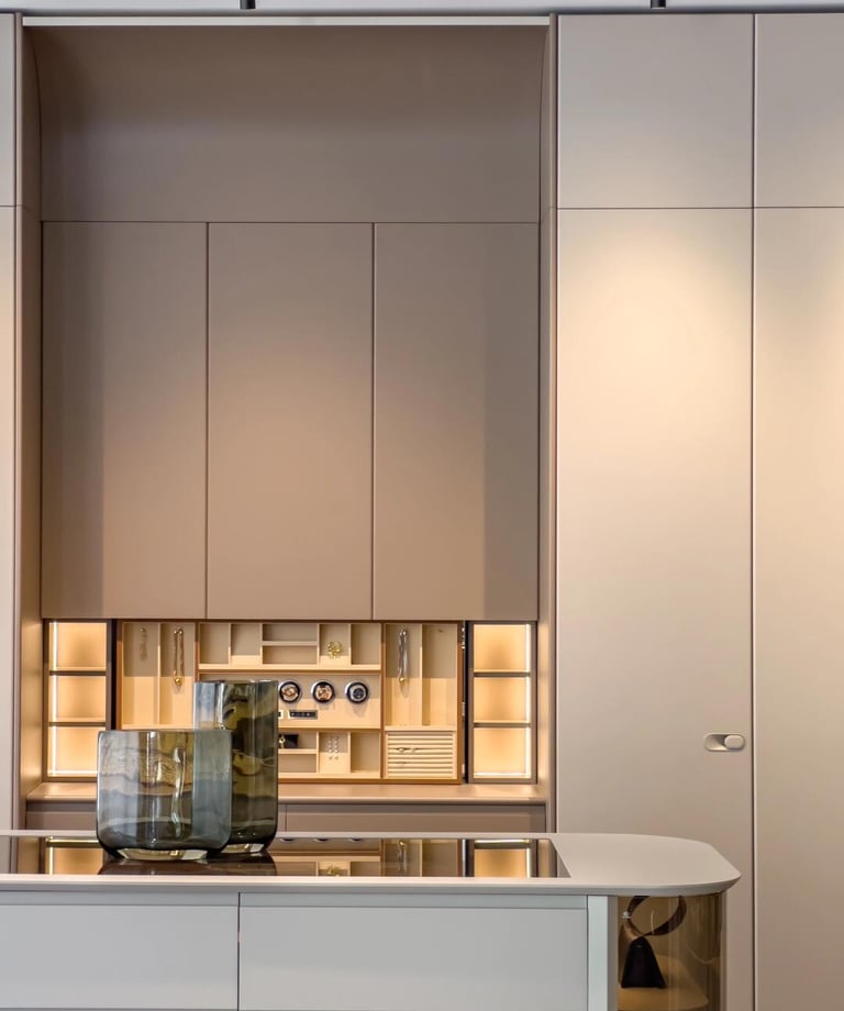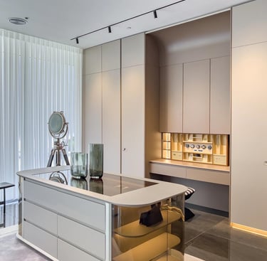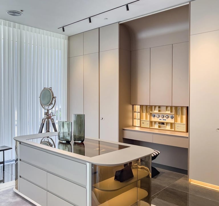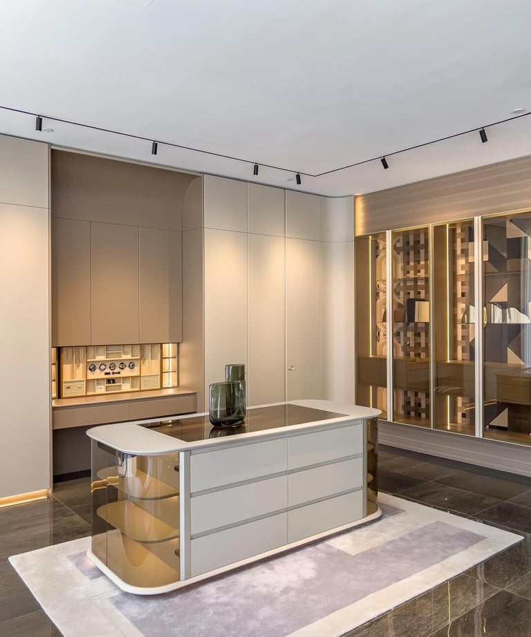 Neo-Minimal Wardrobe Hub blends leather accents, sleek aluminum, and lacquered panels—crafting a sharp, youth-focused space where clean lines and tactile textures meet effortless, modern functionality.