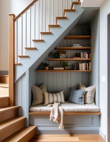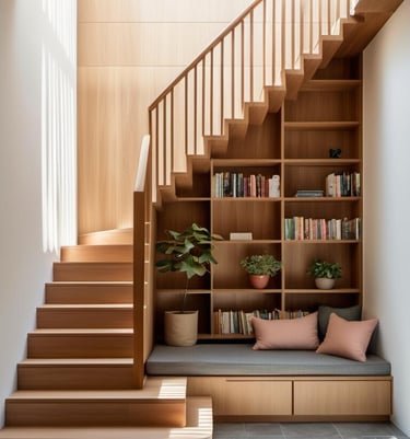 Stairwell Story Hub is a custom built-in shelving style designed for interiors where space needs to be used more intelligently. Suitable for stair-adjacent walls, transitional spaces, compact study rooms, and smaller residential layouts, this design combines display and storage in a practical and visually integrated way.